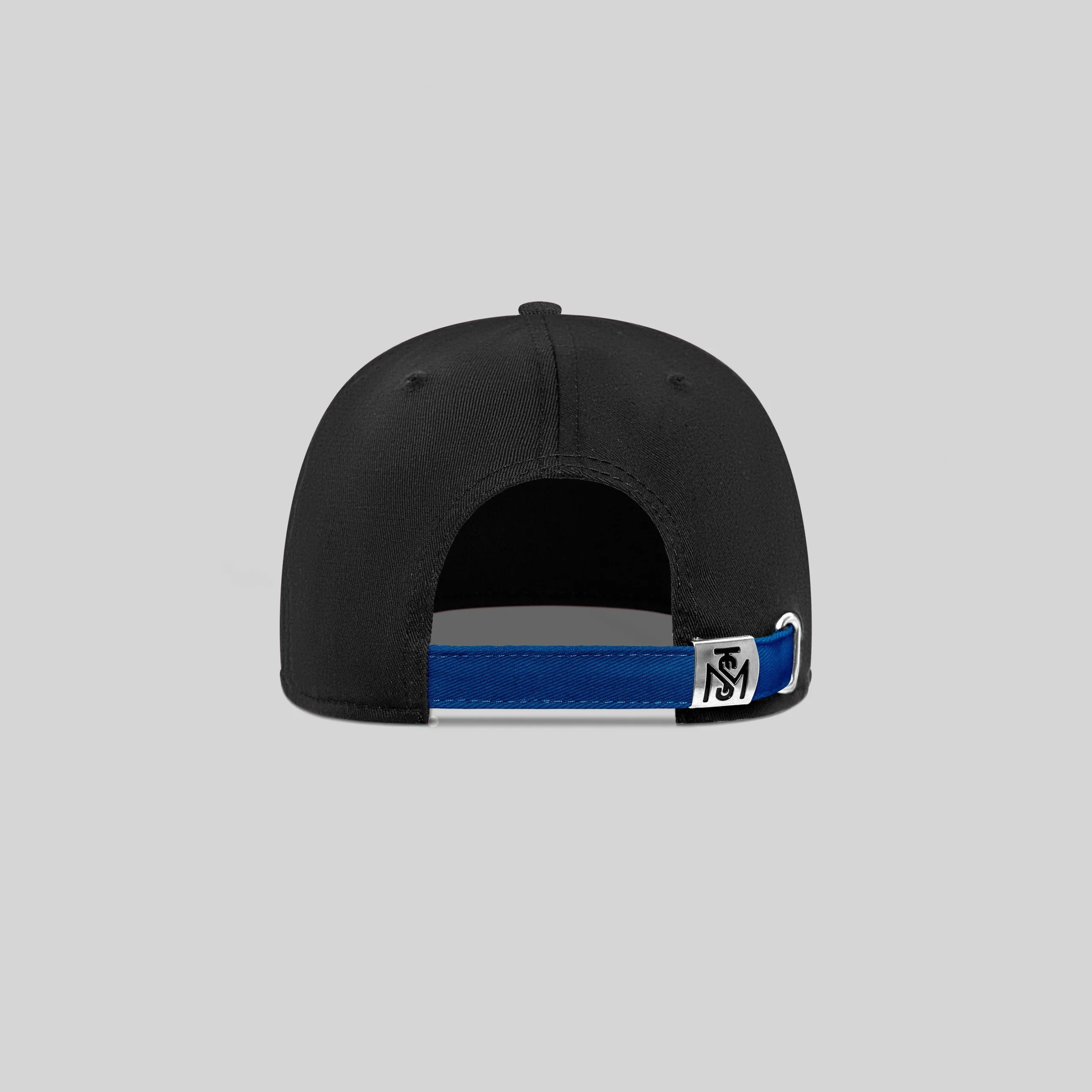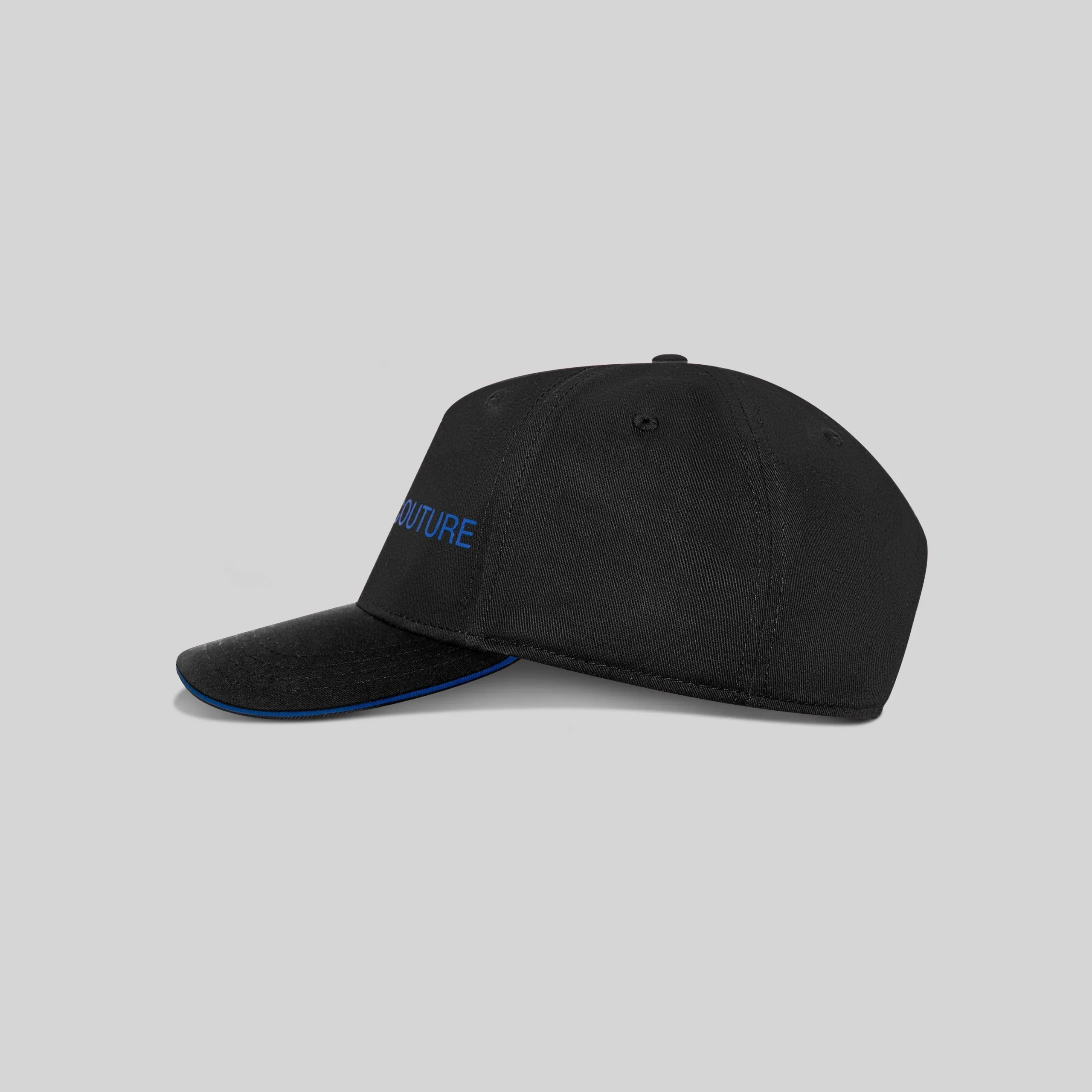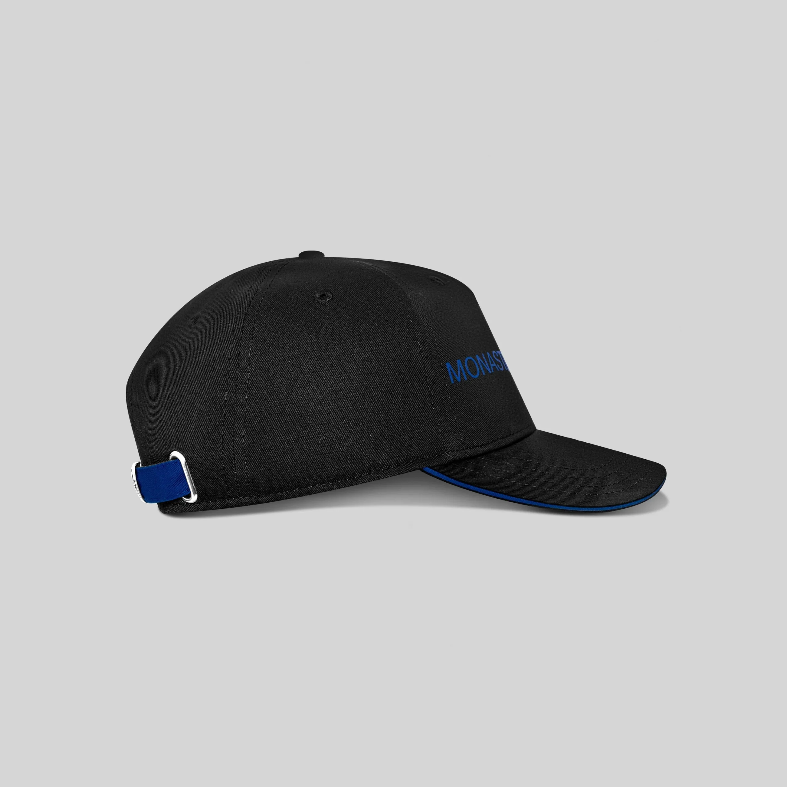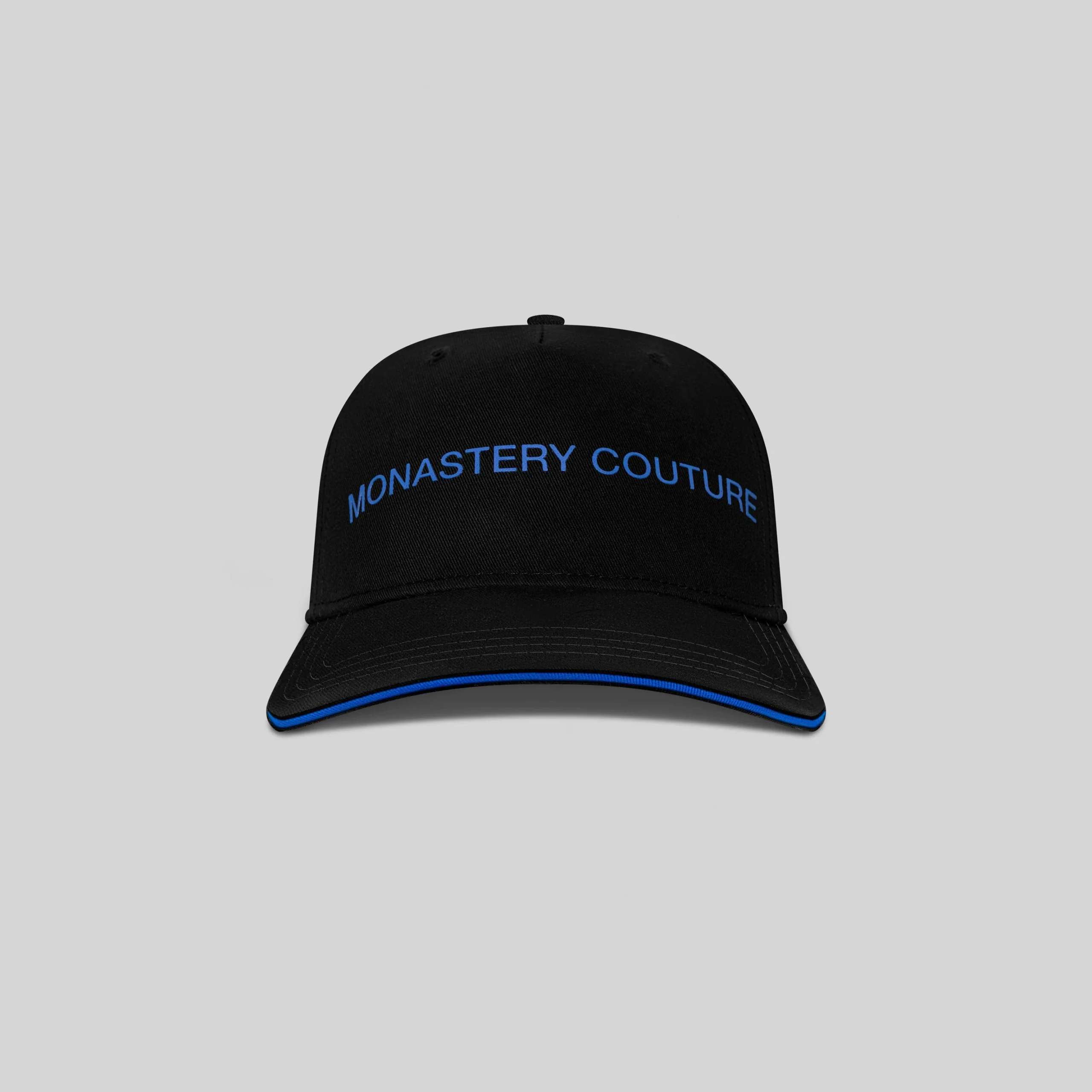 Gorra Malatyo Monastery unisex, elaborada en algodón twill con sistema de cierre ajustable con broche metálico en color azul, enfrente texto monastery couture elaborado en técnica de alta definición.